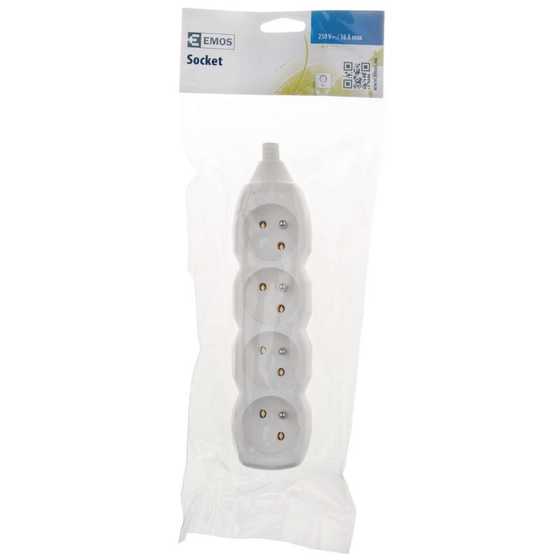 4 zásuvky bez vypínača, ~250 V/16 A max., predajný obal: 1 ks, záves, 4 zásuvka bez vypínača pre pohyblivé prívody určená na výrobu predlžovacích prív...4 zásuvky bez spínača